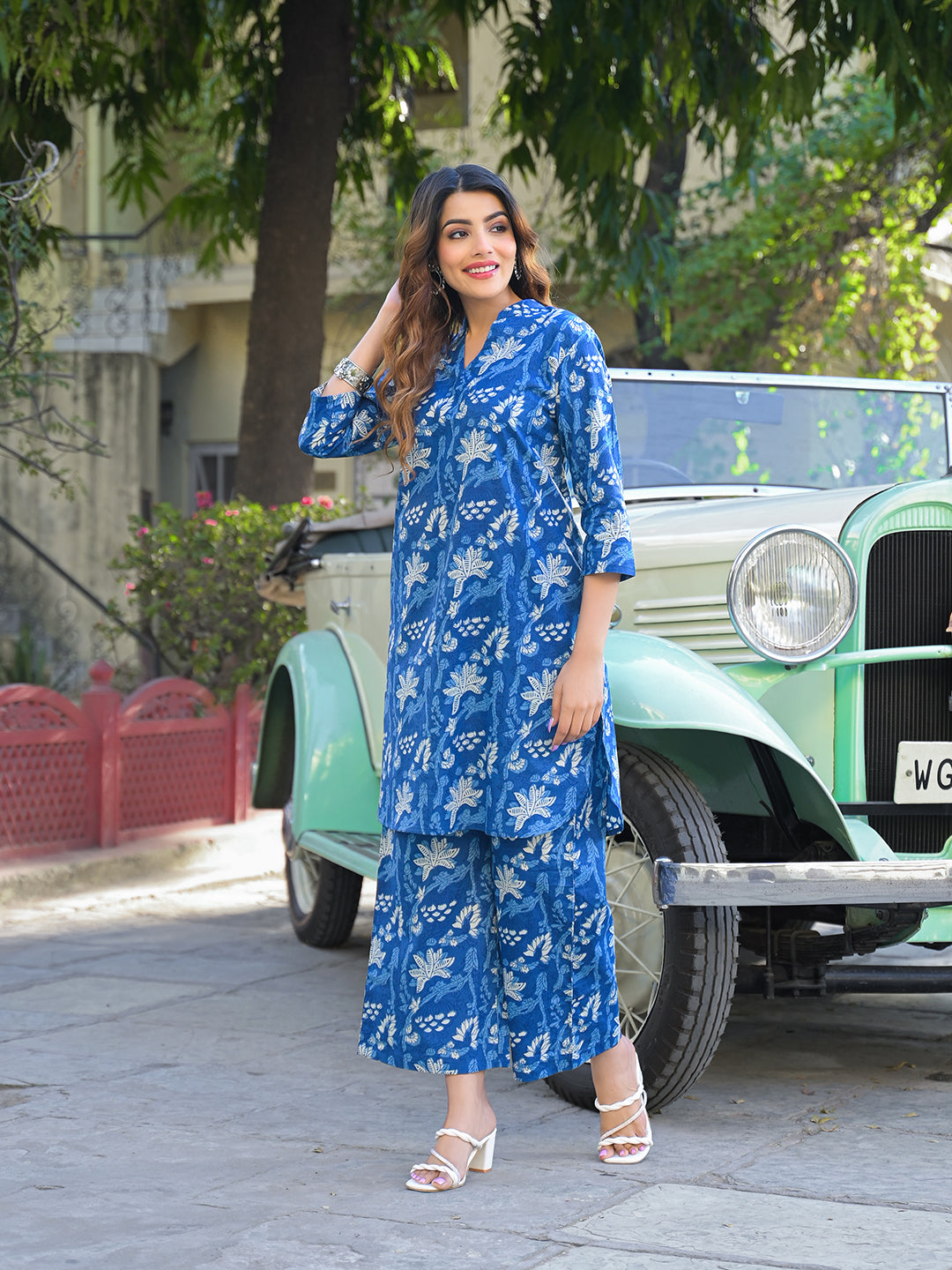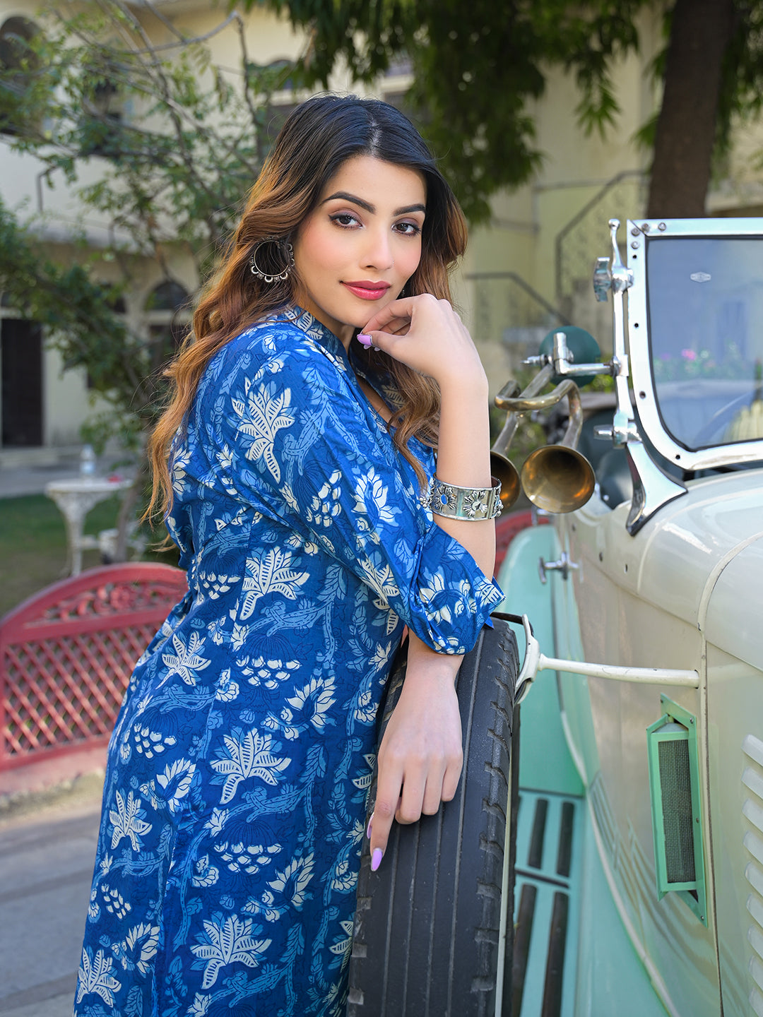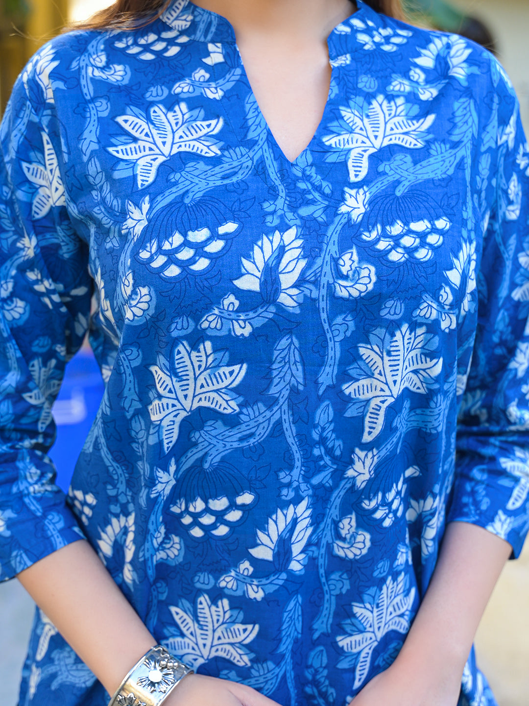 Blue Floral Print Cotton Fabric Kurta with Pant