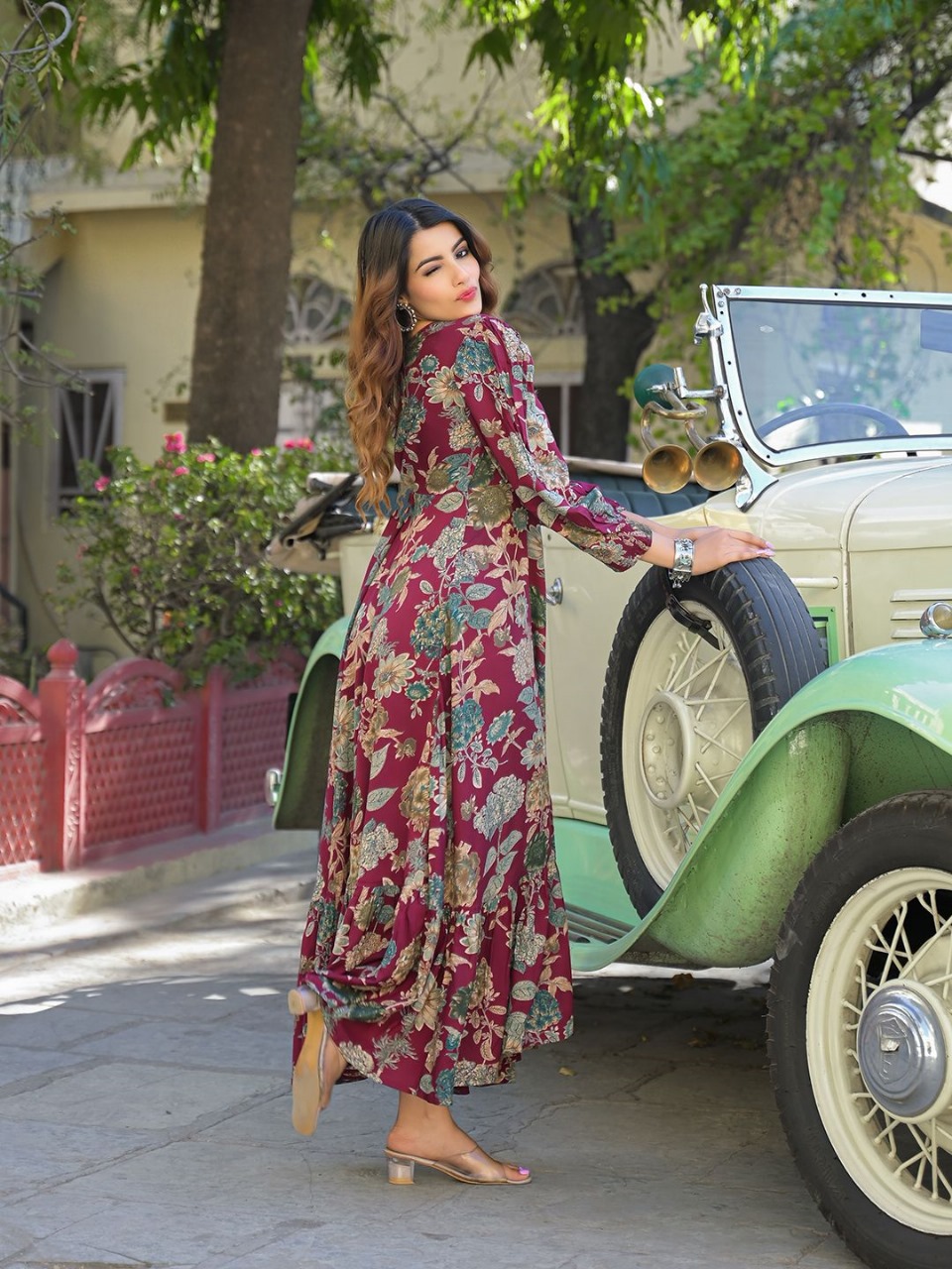 Maroon floral print fit & flare dress
